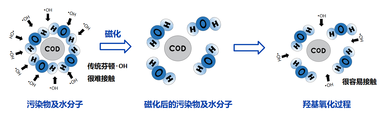 Super Cheap磁芬頓技術(shù):先將廢水磁化,改變污染物分子與水分子之間的排列次序,使羥基自由基很容易接觸到COD,采用定點(diǎn)清除的方法去氧化COD,H2O2的消耗量極低,只有流化床芬頓的30-40%。在實(shí)際工程項(xiàng)目中,體現(xiàn)為:雙氧水投加量少,無需配套脫氣池;